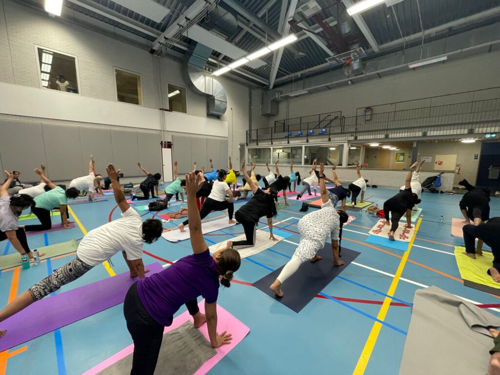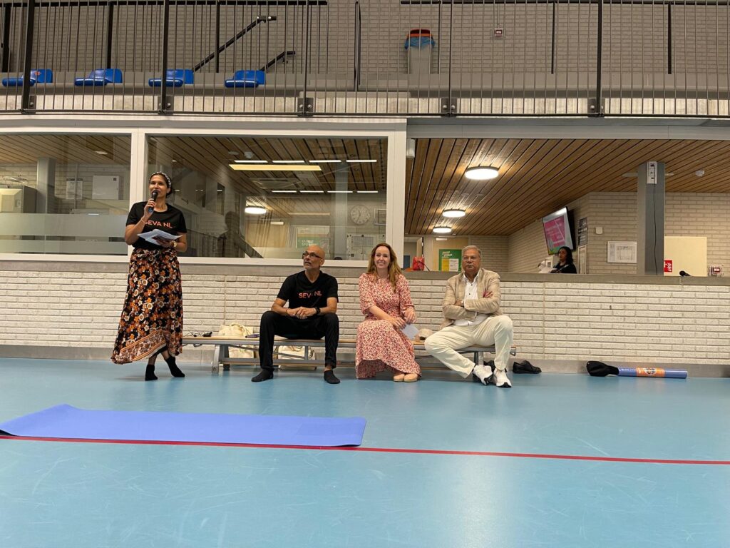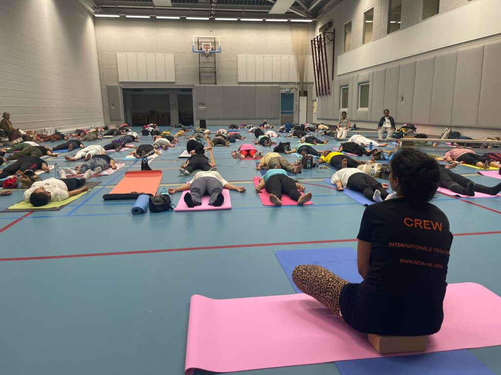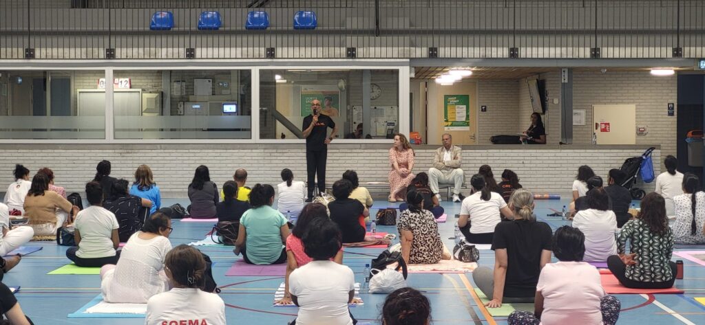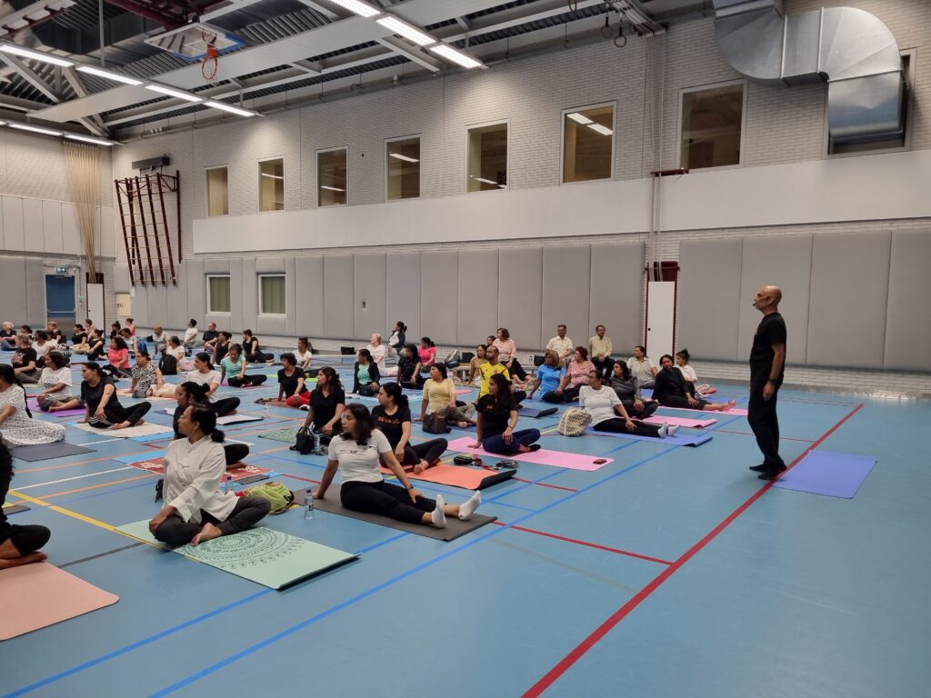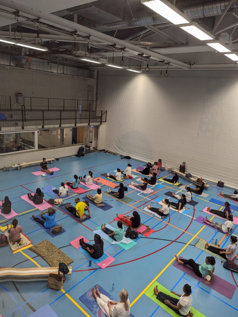 Op zaterdag 29 juni 2024 organiseerden we een Yoga evenement ter gelegenheid van Internationale Yoga Dag. Dit vond plaats in Sporthal Piet Vink in Den Haag van 11.00 tot 16.00 uur. Er werd ook stilgestaan bij 10 jaar Community Yoga in Den Haag. Dhr. Rabin S. Baldewsingh (Nationaal Coordinator tegen Discriminatie & Racisme) en mevrouw Marion Beaujean (stadsdeeldirecteur van Leidschenveen-Ypenburg) waren bij de opening aanwezig en namen een exemplaar van het gedenkboekje (‘10 jaar Community Yoga in Den Haag‘) in ontvangst. Daarna nam Yograj Premacharya het woord en vertelde wat over Community Yoga en gaf achtereenvolgens ook een yoga workshop. Na de lunchpauze met onder andere een lekker vegetarisch broodje en fruit begon workshop ronde 2 waar Janice Aliar een joints & glands sessie gaf en Reeshmi Chitan een stoelyoga sessie. De laatste workshop was voor Geoffrey de Jong met een sound bath sessie en Lakshman Kharagjitsing met een kirtan workshop. Bij vertrek kregen de deelnemers een leuke goodiebag mee. Het was een geslaagde dag met ruim 100 deelnemers en een enthousiast Seva team dat de dag in goede banen geleid heeft. Iedereen wordt bedankt voor zijn/haar aanwezigheid, ook de sponsoren worden van harte bedankt en we gaan van start met de voorbereidingen van een spectaculair Yoga Festival op 21 juni 2025! Graag tot dan! 😊🙏